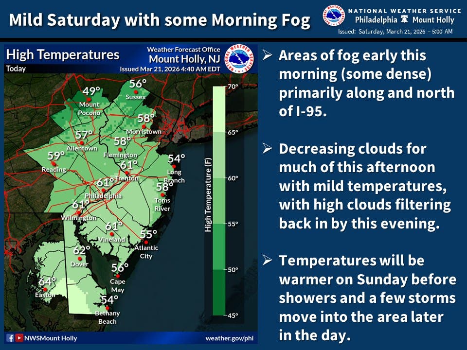 JERSEY CITY, NJ — Temperatures will rise and plummet through Tuesday as the first days of spring may bring thunderstorms and rain to Jersey City.