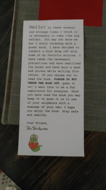 The book mark had a note from "The Bookworm." A mystery good samaritan dropped off some of his or her favorite books on neighbors' doorsteps. The Bookworm sanitized the donation and wore a mask and gloves. And this individual had one request.