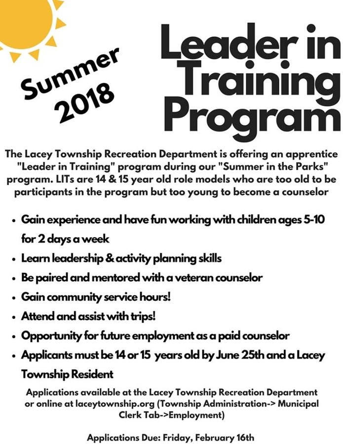 The Lacey Township Recreation Department will be initiating a Leader in Training pilot program for Summer 2018