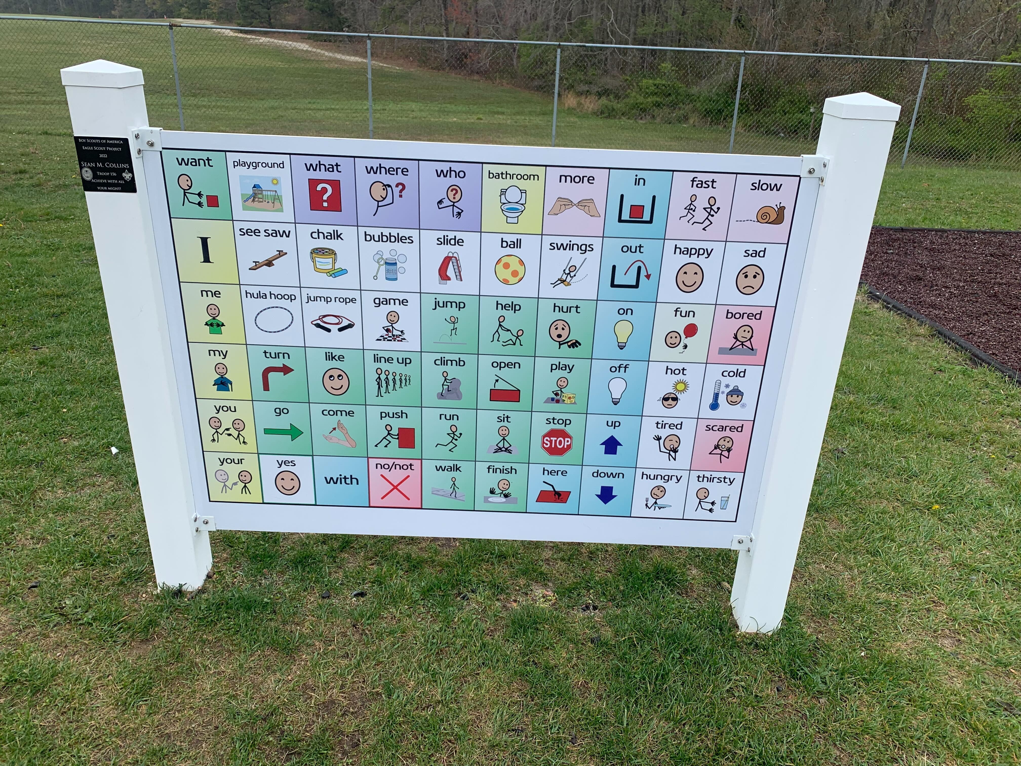 The augmentative and alternative communication (AAC) board now sits proudly at Cedar Creek's playground, where children from all walks of life can use it to talk to each other. AAC boards use simple pictures and words so that nonverbal people can still communicate wants and needs with others.