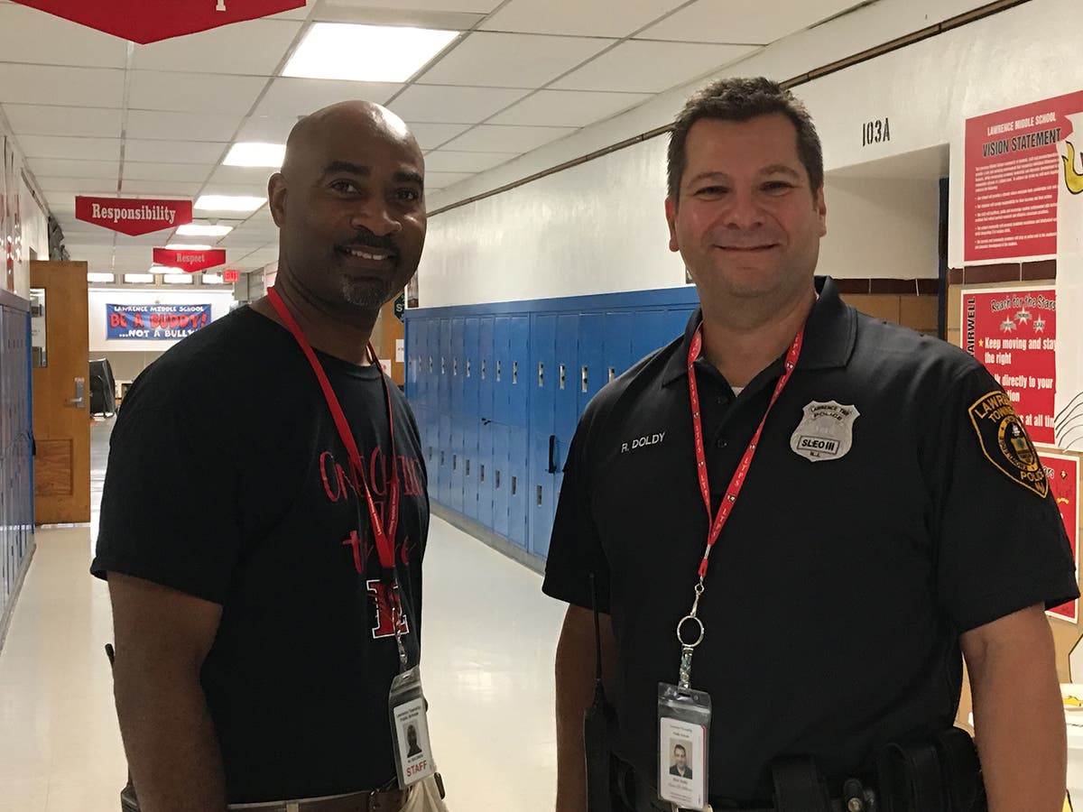 Rick Doldy, a Class III officer pictured above with Lawrence Middle School Assistant Principal Lou Solomon, grew up in Lawrence and is a Lawrence High School graduate. After first starting in electrical engineering, Rick changed careers, became a Lawrence police officer, and earned a BS in Homeland Security and National Preparedness. Rick has high and middle school aged children.