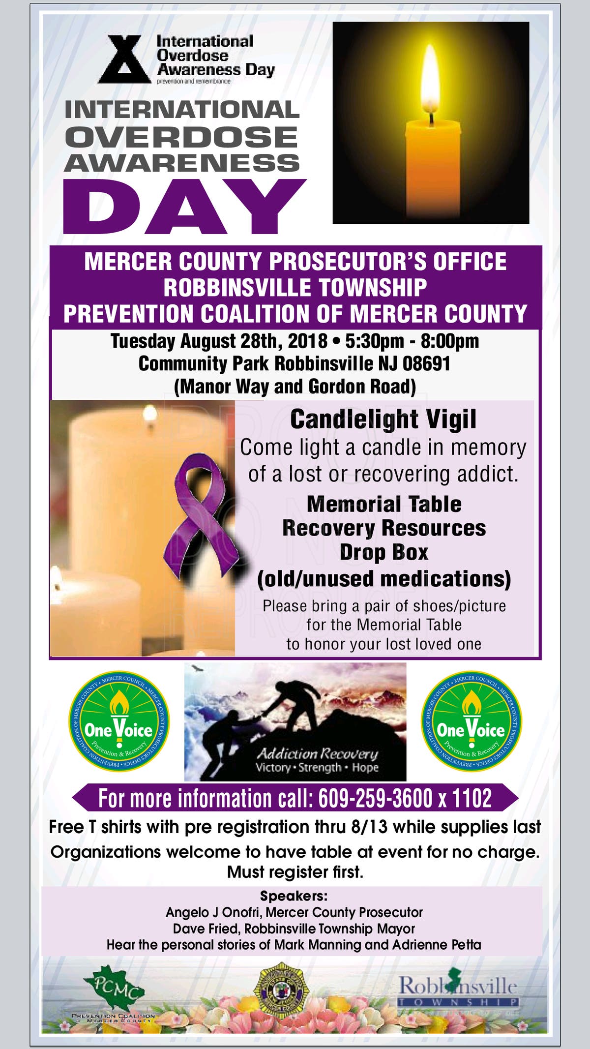 The Mercer County event will take place from 5:30 p.m. to 8 p.m. at Community Park, Manor Way and Gordon Road, Robbinsville, NJ, 08691. There will be a candlelight vigil, a memorial table, recovery resources, speakers and a drop box for old/unused medications. Attendees are asked to bring a pair of shoes or picture for the memorial table to honor loved ones lost to a battle with addiction.
