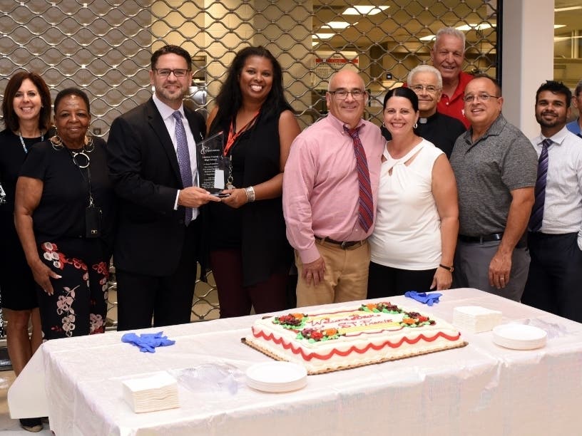 Pictured (left to right): St. Francis Medical Center colleagues Sharnee Moore-Jervis, Paula Levinsky, J. Delores Baker, and John Luchansky, who presented a plaque to Trenton Central High School Principal Hope Grant (center), along with Trenton Mayor Reed Gusciora, Rosa and Freddie Rosado, of McDonald's, Fr. Carmen Carlone, St. Francis; Carmen Guagliardo, of People's Bakery (back row), Dr. Anand Kaji, St. Francis, and Eddie and Chris Baldassari.