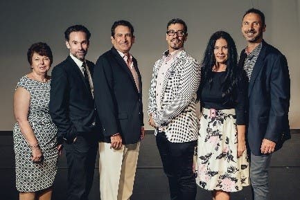 Diane Grillo, VP Health Promotion, Robert Wood Johnson University Hospital Hamilton, event co-chair; Matthew Hardy, lyricist; Richard Freeman, President & CEO, Robert Wood Johnson University Hospital Hamilton; Mark Roxey, artistic director, Roxey Ballet, choreographer; Lisa Freeman, RWJUH Hamilton Foundation board member, event co-chair; and Robert Maggio, composer; gather together following the WE vs. C breast cancer awareness event Sunday, June 4, at the Grounds for Sculpture in Hamilton. Courtesy of RWJ Hamilton.