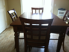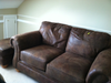 beautiful brown suede/leather love seat with ottoman and brand new pub style dining room table with leaf and 4 upholstered chairs to match. Also, bright decorative art work (paintings) from original owner