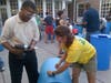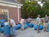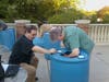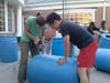 Rain barrel builders filled the patio outside the library. Some straddled the big blue barrels, which were donated by Ocean Spray and were once used to hold cranberry juice, in order to drill holes in them for spigots.