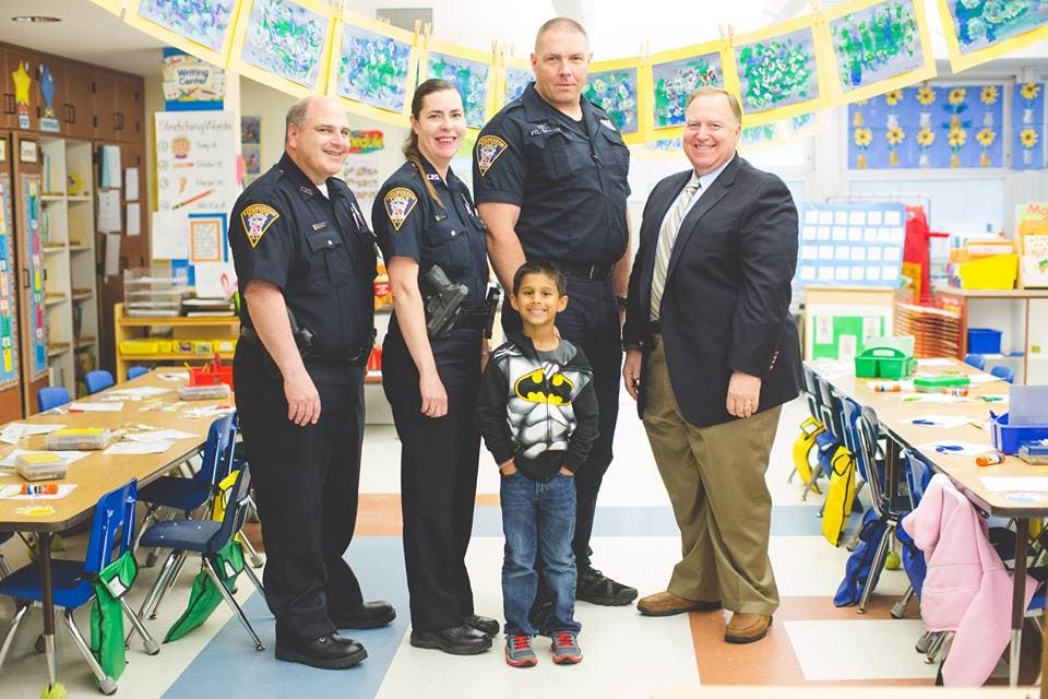 As a prize for a contest, a Mt. Pleasant Elementary School kindergarten student recently got the chance to spend the day with LPD Chief Craig Handschuch and three officers: Gary Mankowitz, Joy Klapal and Ralph Kolbutz.