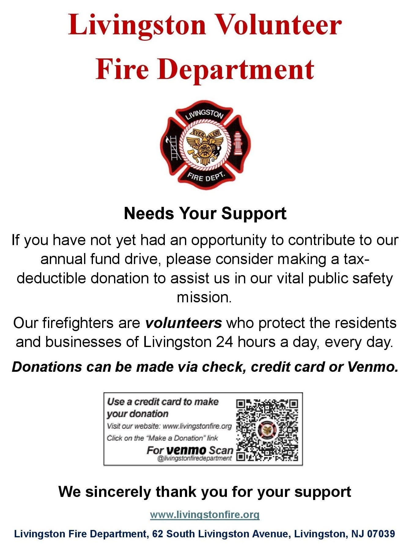 All of this, and much more, is made possible thanks to your past generous donations. Once again, the members of the Livingston Volunteer Fire Department seek your financial support during our annual fund drive. As always, we continue to appreciate your continued assistance and would be most grateful if you would complete the enclosed form and return it to us along with your tax deductible donation.