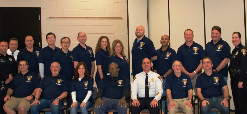 Photo: Seated left to right: Scott Lantzman, Michael Solomon, Stacy Sherman, Keith Hines, Chief Gary Marshuetz, Steve Kroll, and Ruslan Milov, standing left to right: Officer Kevin Mullaney, Captain John Drumm, Monte Ehrenkranz, Zhengmao Li, Yufei Li, Todd Sherman, Judith Heller, Robin Hecht, Brian Bradley, Anuj Goyal, Jared Resnick, Scott Sundick and Officer Joy Klapal. Also graduates, but not present at the ceremony were Lauren Dragone and Neil Greco.