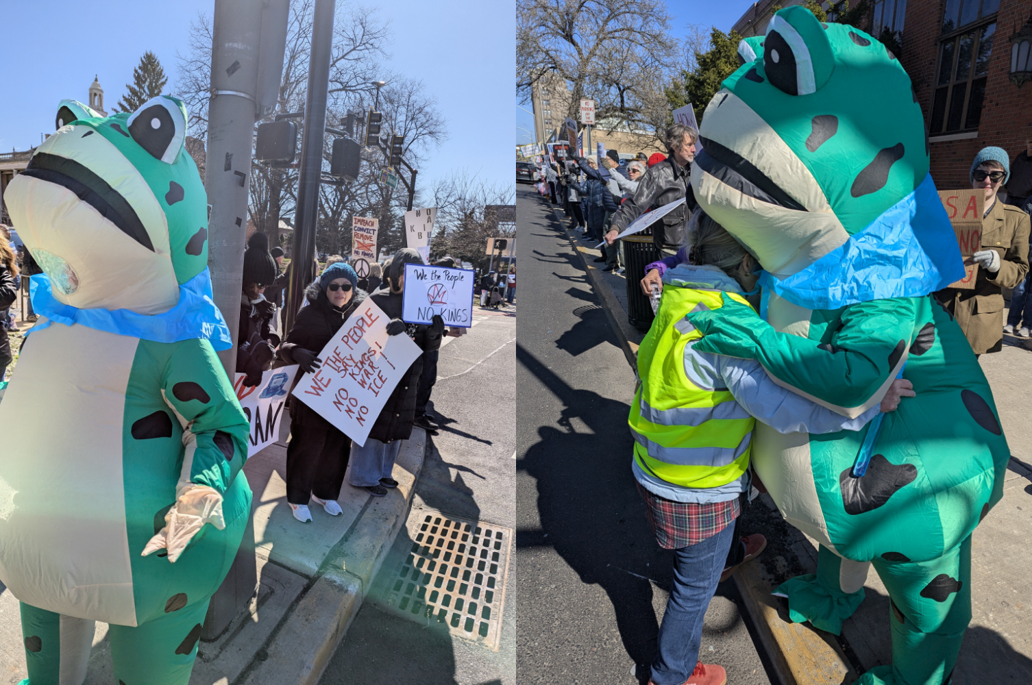 Nearby in Bloomfield, a protest took place in front of town hall. Attendees included a protester wearing an inflatable frog costume, a tactic that some anti-Trump activists have been embracing as a display of non-violence.