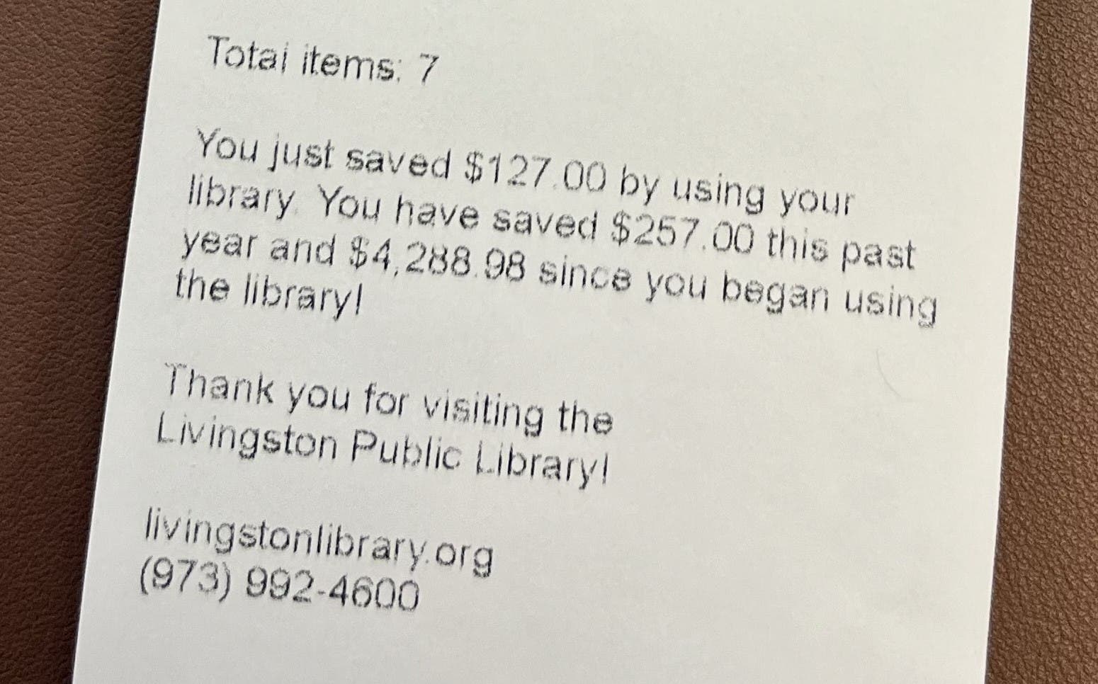 According to Cesena, the receipts are processed through the Bergen County Cooperative Library System (BCCLS), which includes Livingston among its 78 member libraries in Bergen, Essex, Hudson and Passaic counties. Each of these libraries informs their patrons how much they are saving in a given year and over their lifetimes.