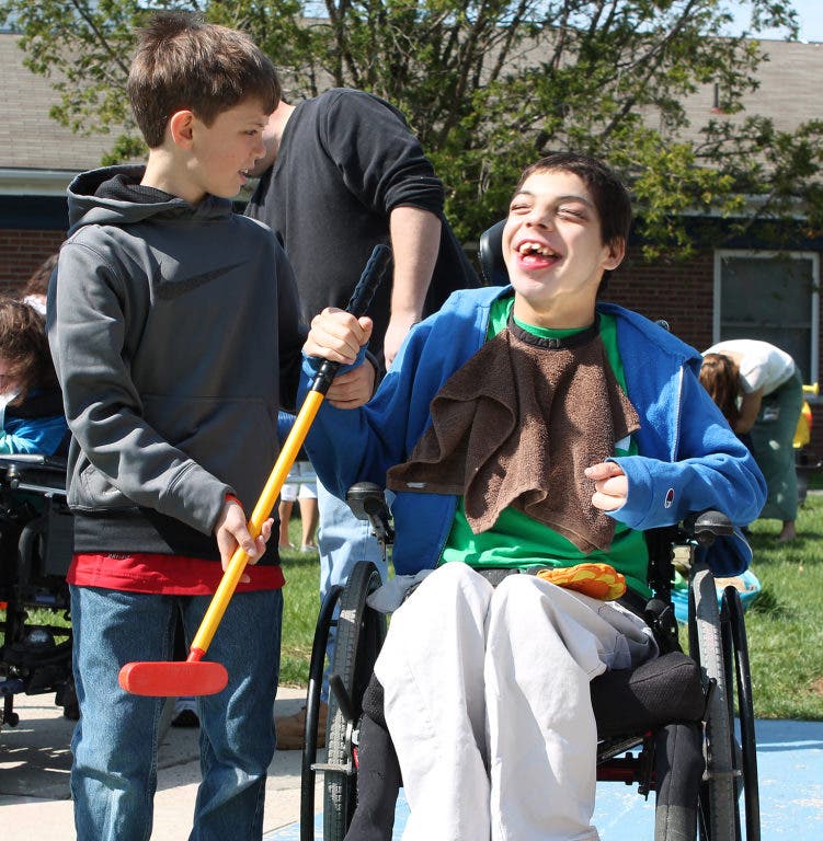 The visitors included three students from the Flocktown-Kossmann School in Long Valley -- third grader Tyler Fraumann, son of Matheny School technology coordinator Alex Fraumann, and twin brothers John and James Ebert, fourth graders who are Alex Fraumann's nephews. The Flocktown students and other visitors saw how Matheny students benefit from the latest technology such as SMART Boards and Tables and iPads. They also attended several classes, from preschool to high school. They participated in a variety of adapted sports, and it was an eye-opening experience for many, giving everyone a better understanding of the challenges and triumphs experienced daily by The Matheny School students and staff.