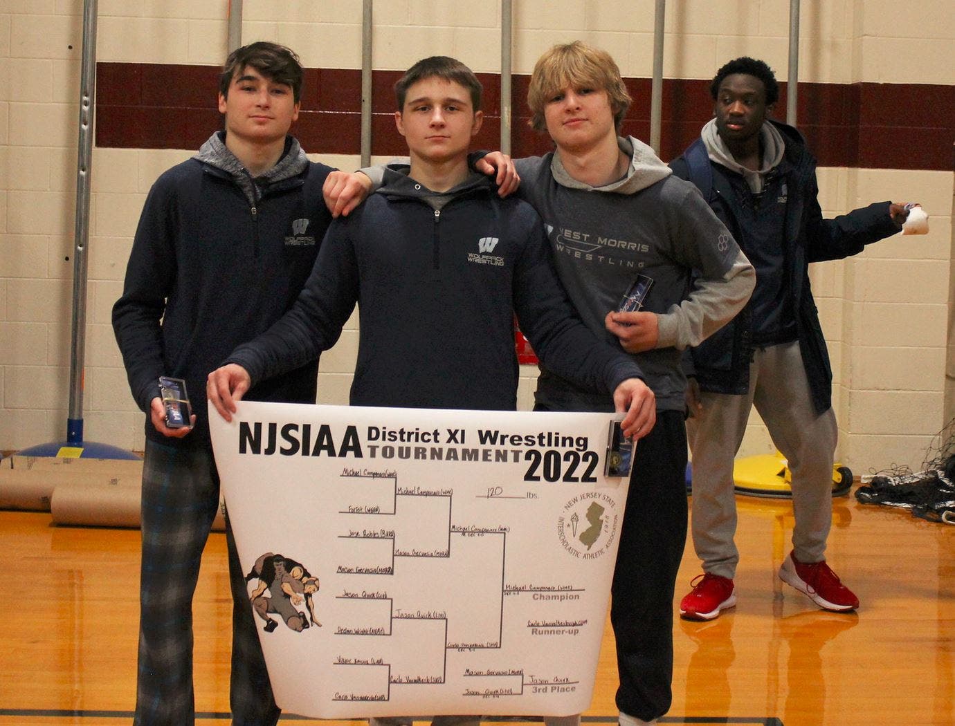 Michael Campanaro, Brandon Dean, Malachi Shepard and Henry Frayne were crowned NJSIAA District 11 champions Saturday, as Coach Chris Marold’s West Morris Central wrestling took team bronze at Morristown High School.