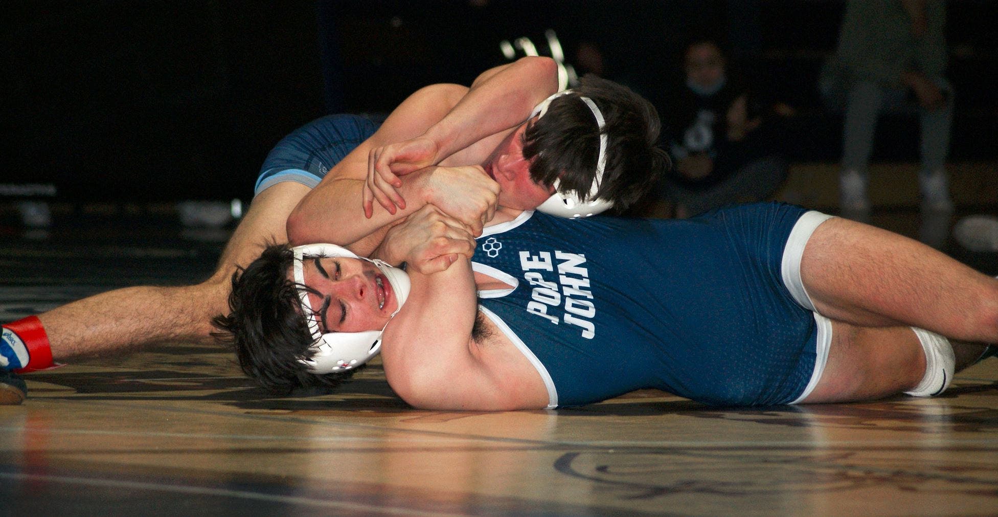 (1/25) After Montuore put the Wolfpack on the board with a convincing 6-0 shutout victory, Ferrante stunned the Pope John faithful by pinning one of New Jersey’s best, Carson Walsh, in just 28 seconds. Walsh is Pope John’s second highest ranked wrestler at #13 in the state.