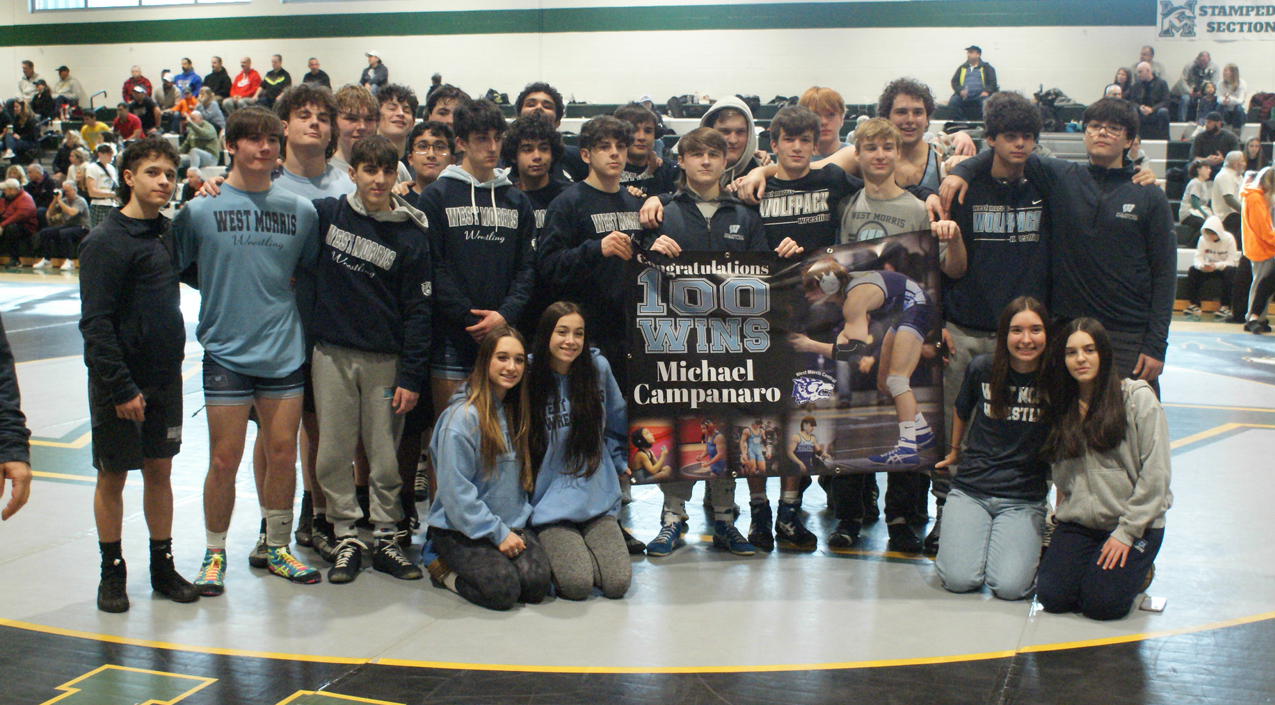 In a history-making week, the West Morris Central wrestling Wolfpack won its 10th-ever Conference championship (Jan. 18), and Michael Campanaro joined the elite Century Club with his 100th career win (Jan. 21). That celebration buoyed the Pack to sweep the Montville quad, defeating the host team, Caldwell, and Bridgewater-Raritan to raise its record to 10-4.