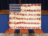 Bruno is referring to the piece of canvas now adorned with a hand-painted replica of the American flag. The veterans came in, had their hands painted red, and made imprints in straight lines to mark the stripes on flag.