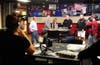 Field producer Matt Carter clears the entrance to the Student Center at the College at Florham. Students walking through the building scoot over to avoid the shot. Director Cyndi Haas adjusts her monitor and calls out, “Action!”
