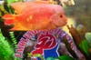 “It’s a community tank that features red devil hybrids, algae eaters, South American cichlids, red Texas cichlids, flower horns, king parrots, fire eels and red hooks,” says Raymer. The fish are a mixture of aggressive and non-aggressive species to create a more friendly, less hostile environment.