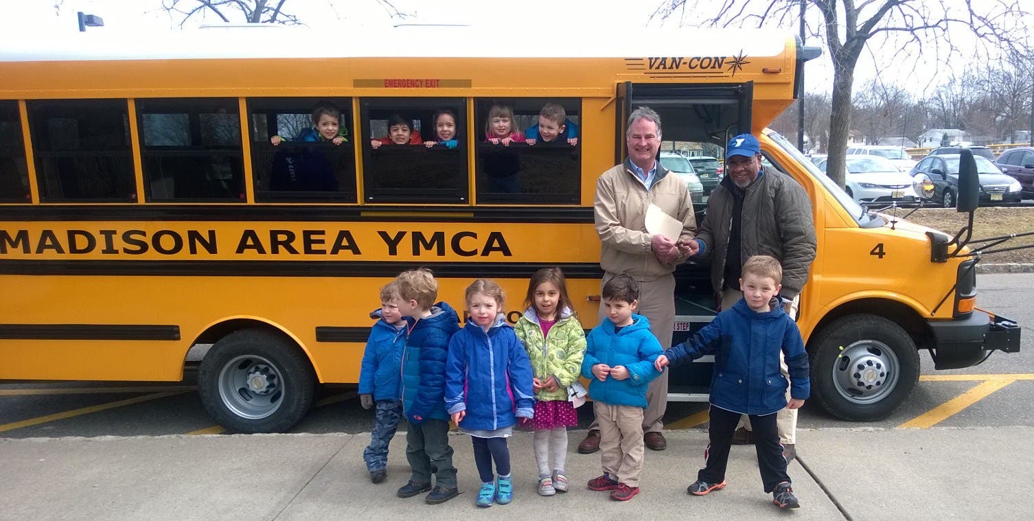 Standing in front of the bus: L-R: Emmett Wheeler, 3, of Florham Park; Henry Stoll, 4, of Chatham; Jillian Rubin, 3, of New Providence; Julia DeGarcia, 5, of Madison; Mason Dewar, 3, of Madison; Patrick McKeever, 5, of Madison; Madison Area YMCA Vice President of Operations Bob Conley and F.M. Kirby Children’s Center Transportation Manager James Guischard of Maplewood.