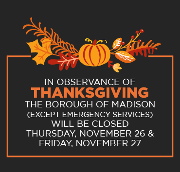 The Borough of Madison will be closed in observance of Thanksgiving on Thursday, November 26, and Friday, November 27, 2020.