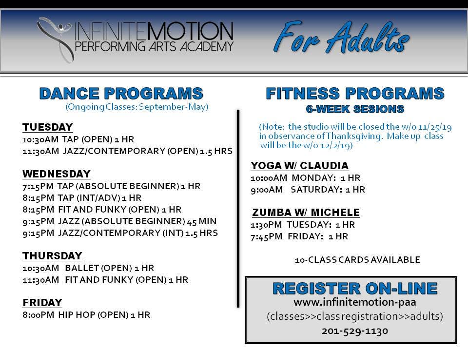 Adult Dance & Fitness Classes have been added to the fall programming @ Infinite Motion Performing Arts Academy in Mahwah!