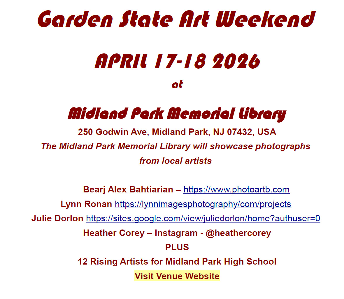 Mahwah|Local EventGarden State Art ExhibitAlex B., NeighborApr18Event DetailsSat, Apr 18, 2026 at 10:00 AMAdd to calendarMidland Park Memorial Library, 250 Godwin Ave, Midland Park, NJ, 07432Photo/Art ExhibitShare