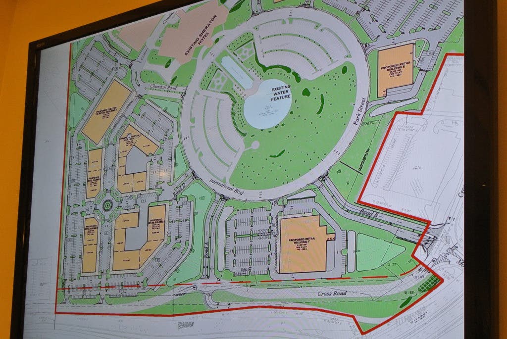 The tweaked internal traffic plan presented by civil engineer Michael Junghans Monday included several changes to the design of the interior of the site - including turning the current traffic circle into a two-way road, with a turning lane in the middle, and adding a sidewalk running around the entire loop, which would connect the smaller retail side of the development with the big box side.