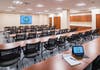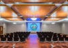 The multi-purpose conference center was designed for both special events and daytime meetings, with floating wood panels on the ceiling.