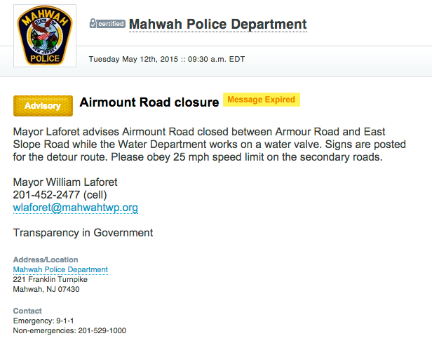 Every message that is sent out on the Mahwah Police Department’s Nixle account bears Laforet’s name, his cell phone number, township e-mail address, and the message “transparency in government.”