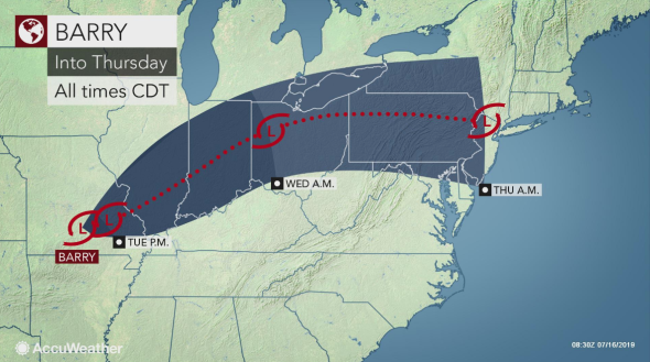 Spotty thunderstorms will ignite on Wednesday afternoon with more numerous showers and thunderstorms to follow at night and into Thursday as Barry's moisture surges eastward, according to AccuWeather.