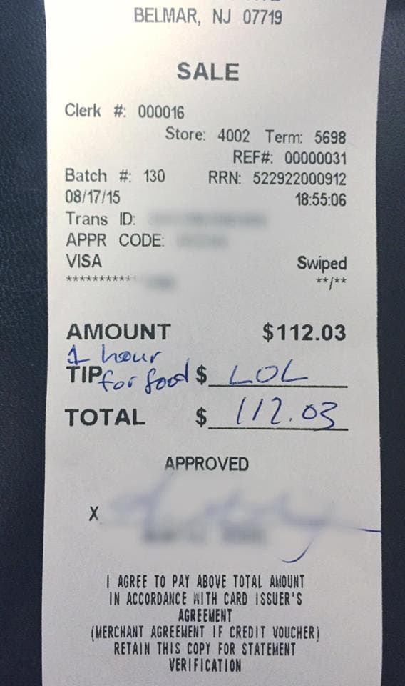 N.J. Waitress Gets Taunting Tip: 'LOL'