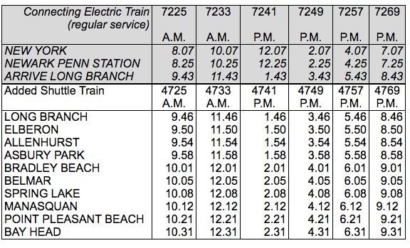 Every train operating between Long Branch and Bay Head stops at Belmar. Customers traveling from points north of Long Branch, including Newark and New York, should transfer across the platform at Long Branch Station to continue their trip. Service between New York and Long Branch will operate on a regular weekend schedule.