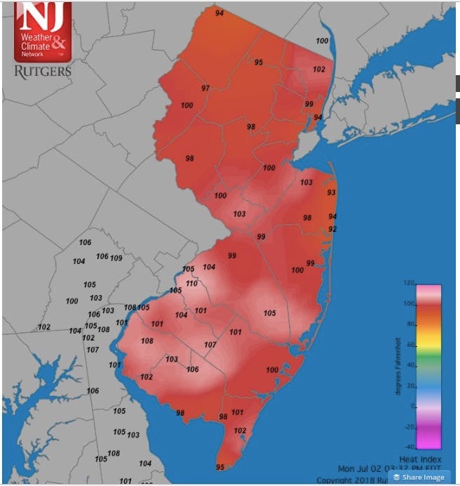 After parts of Mercer County and Monmouth County reached a 110- to 111-degree heat index on Sunday, parts of Camden County hit 110 on Monday. Parts of Monmouth and Middlesex counties hit 105 and higher.