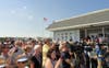 The governor highlighted his administration's efforts and accomplishments in protecting natural resources at the Jersey Shore, which were met with applause from a crowd of onlookers who gathered to hear his speech.
