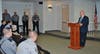 (Photos provided by the Manchester Township Police Department. 1. Tracy Thompson pins the corporal badge on Officer Douglas Higgins. 2. Mayor Kenneth Palmer delivers remarks. 3. His first duty as corporal, Cpl. Douglas Higgins presents Tracy Thompson with the American Federation of Police, American Police Hall of Fame Medal of Honor plaque in honoring her husband, Cpl. Scott Thompson. They are joined by Police Chief Lisa Parker.)