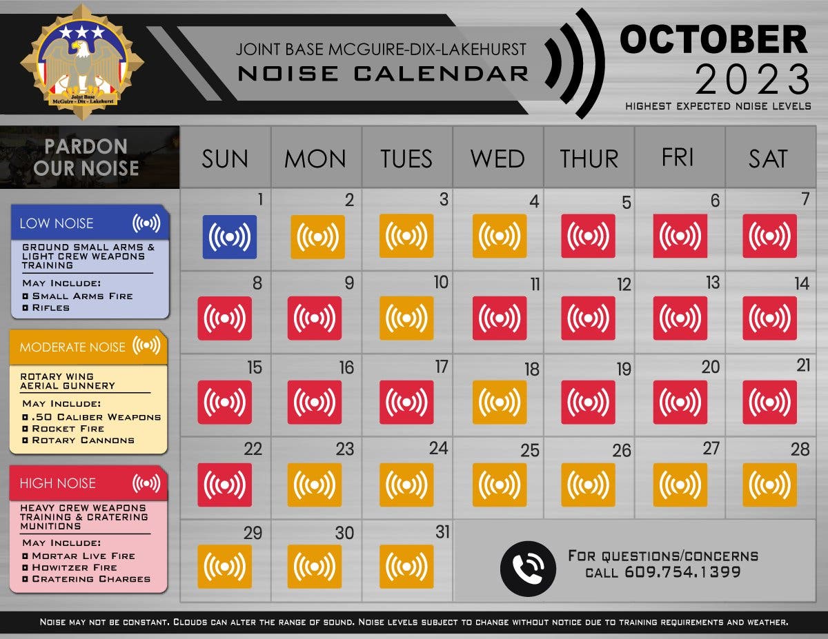 The base's noise calendar for October said loud training is on the schedule, with high noise levels nearly daily through Oct. 22 (Oct. 18 is listed as a medium noise-level day).