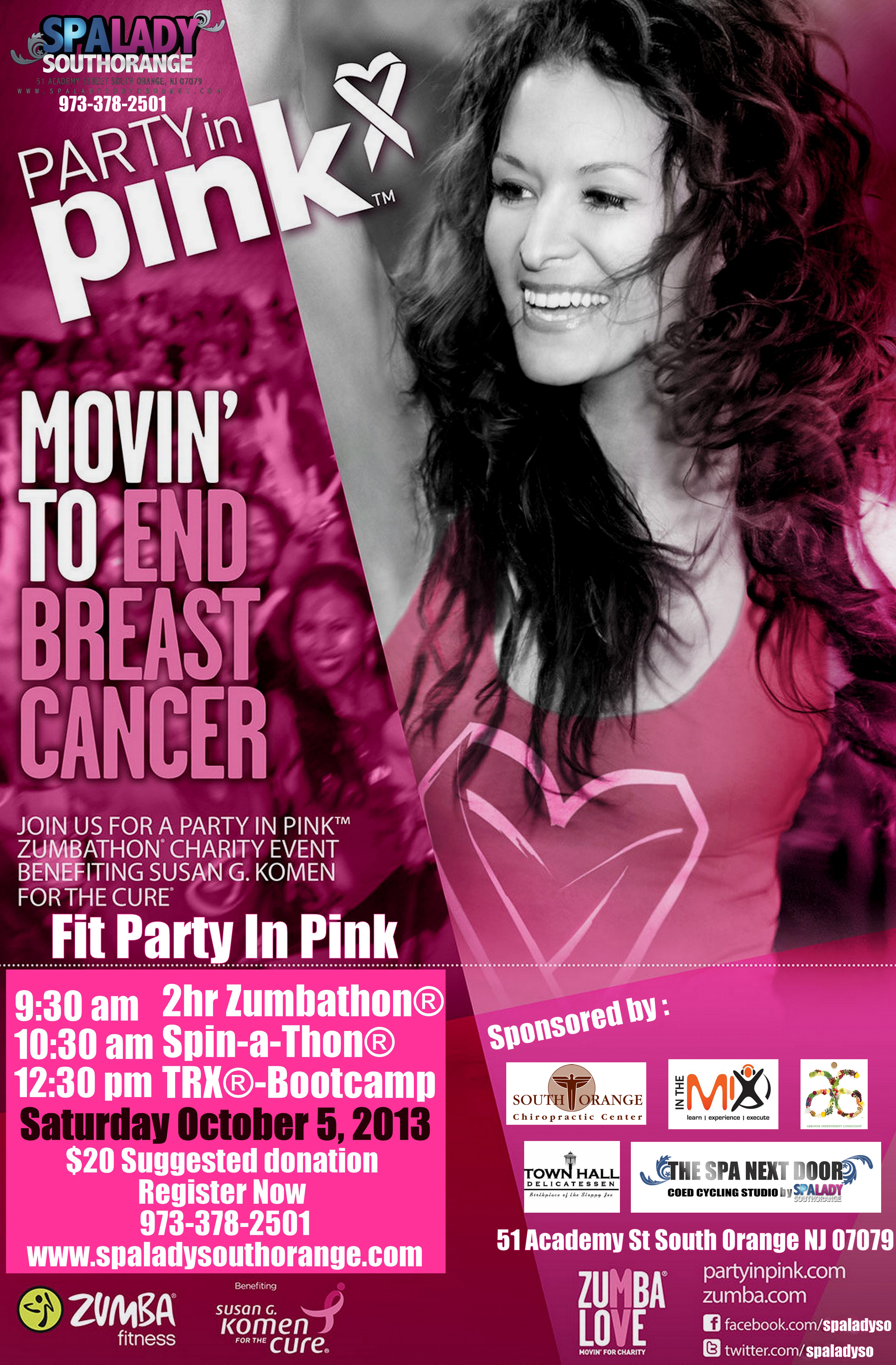 Suggested donation $20 for a fun-filled day of Zumba® classes, raffles, vendors, refreshments, live music & much more. If you have any questions, please contact the spa at 973.378.2501. Also, don’t forget to take advantage of our Party in Pink™ Zumba ® clothing on sale now, 30% of the proceeds go to the Susan G.Komen® foundation for the cure.