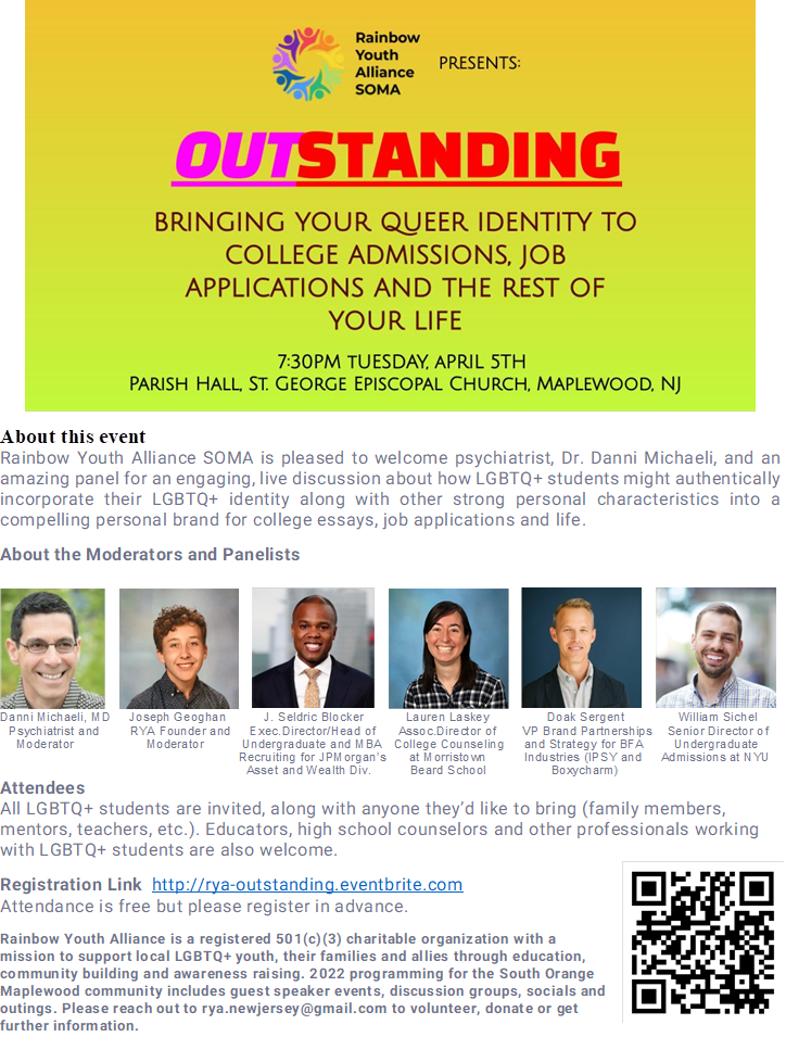 MAPLEWOOD, NJ — Not all LGBTQ+ students are comfortable "outing themselves," noted a representative from the Rainbow Youth Alliance of South Orange and Maplewood, so how or when to refer to their identity in a school or job interview is a matter that requires thought.
