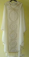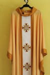 The gold and white vestments will be used for celebrating the joyous events in the Catholic calendar: Easter Sunday, Christmas, the Annunciation, and, yes, funerals — because the faithful are born into a new life. White is also the church-sanctioned color worn for the feasts of the Blessed Mother, to symbolize her purity.