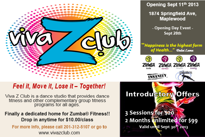 Introductory Specials: 3 sessions (of any type of Zumba® or Insanity®) for $20 and 2 Months Unlimited for $99. It's Viva Z Club on 1874 Springfield Ave, Maplewood... please come by and try a class! Visit http://www.vivazclub.com or http://www.facebook.com/vivazclub