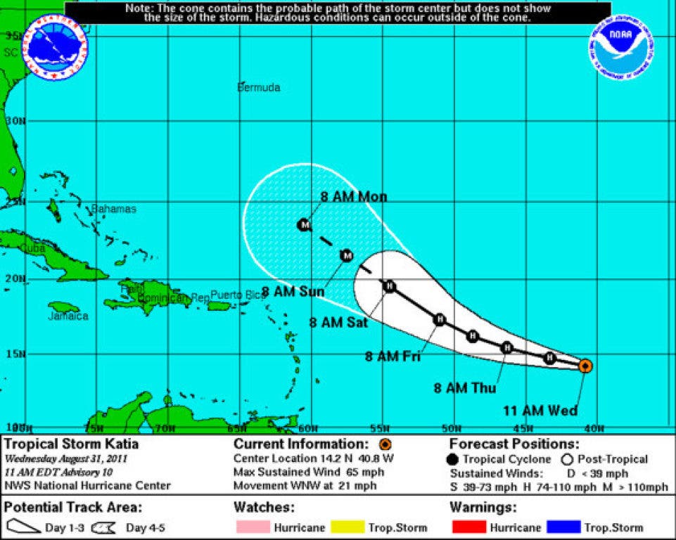 Katia was located at 14.2°N 40.8°W and was traveling west-northwest at 21 mph.