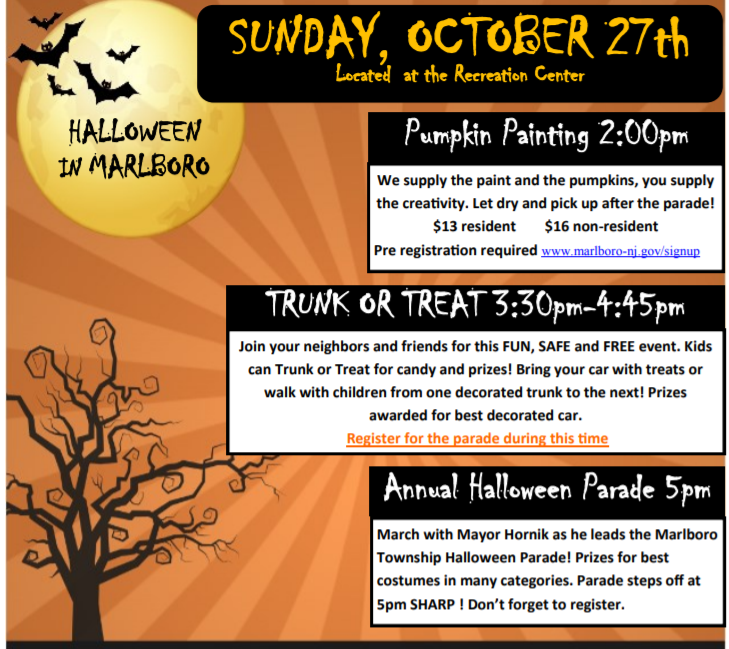 MARLBORO, NJ — Marlboro Township's annual Halloween parade and "Trunk or Treat" will be this Sunday, Oct. 27 at the Marlboro Recreation Center.