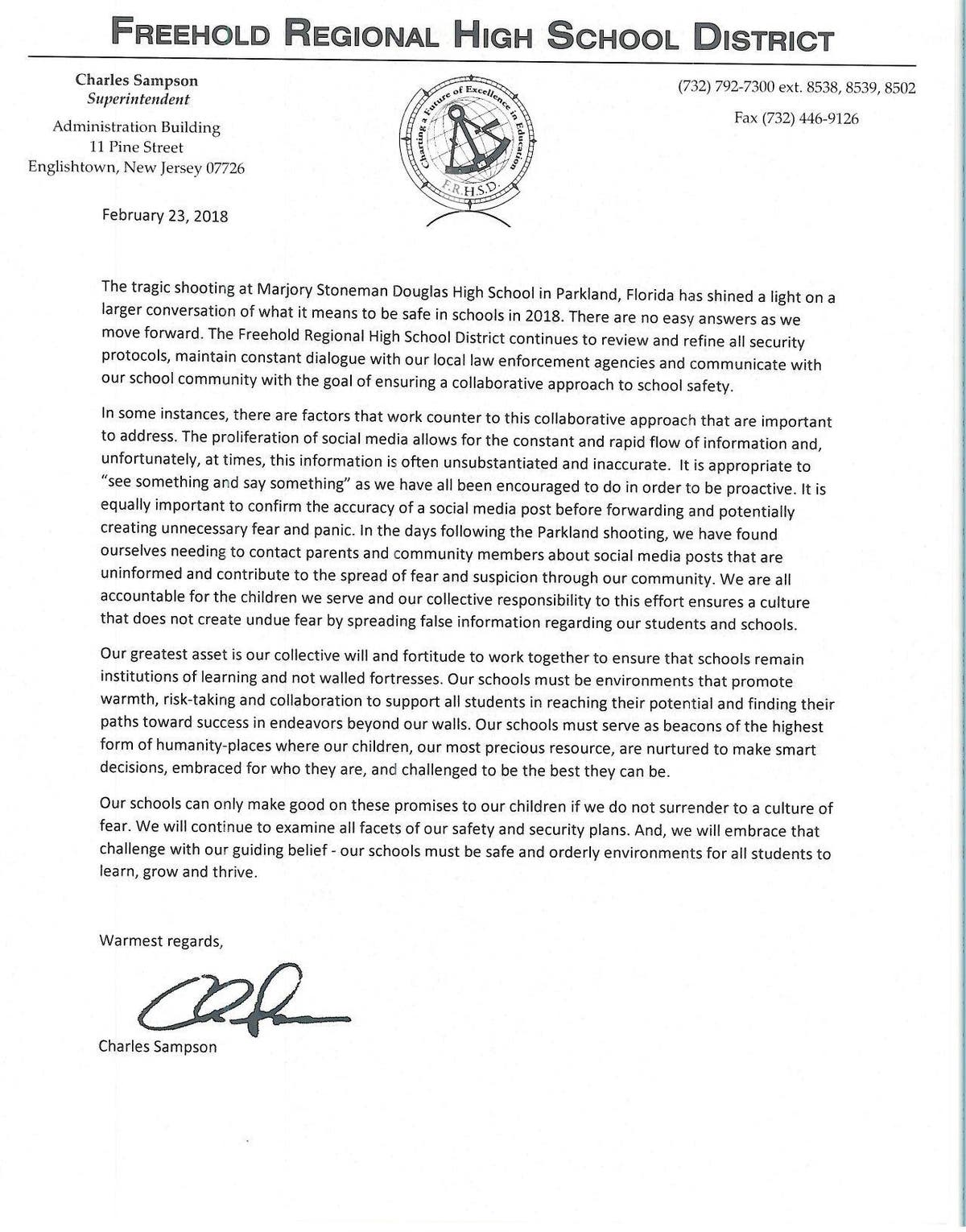 In the notice, Freehold Regional administrators said security procedures were reviewed at all six high schools: Howell, Colts Neck, Freehold Borough, Freehold Township, Marlboro and Manalapan high schools.