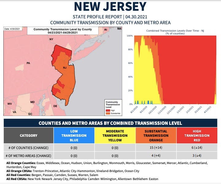 The report, released Tuesday, identifies several counties as being in the “high” zone for community transmission, showing that New Jersey is not completely out of the woods in the COVID crisis. The report is based on data for the week ending April 29th.