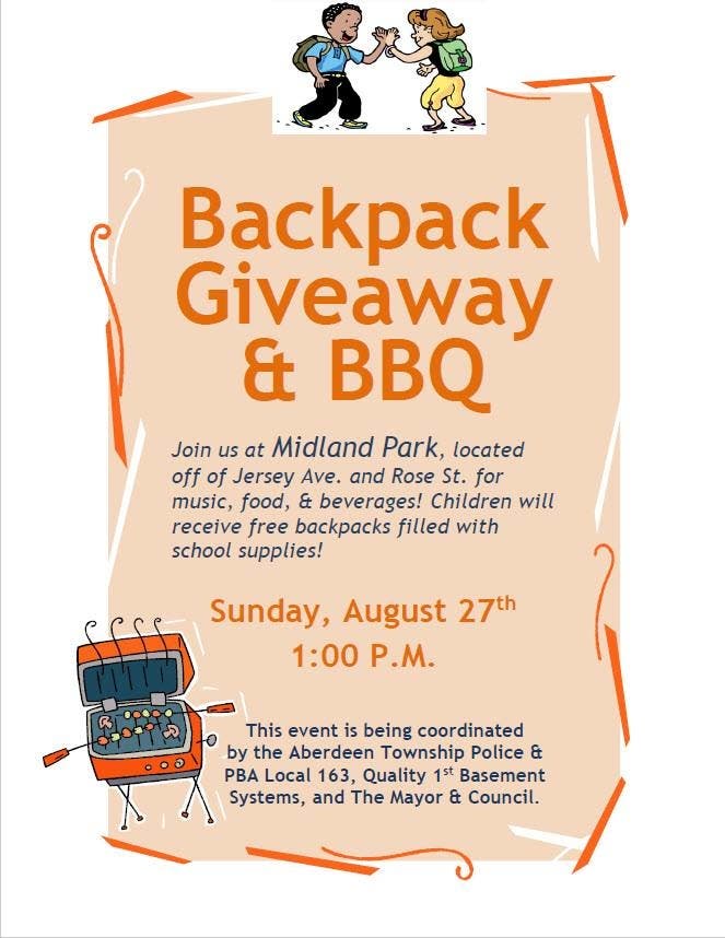ABERDEEN, NJ — Many local community organizations and a local business donated yet again to Aberdeen Township's annual Backpack Giveaway BBQ. The BBQ will be Sunday, August 27 this year at Midland Park. It will begin at 1 p.m.