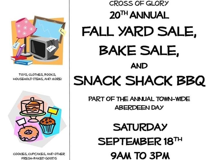 Cross of Glory Lutheran Church invites you to come check out the bargains, the baked goodies and burgers n dogs at our 20th Annual Fall Yard Sale, Bake Sale & Snack Shack BBQ on Saturday, September 18, 2021 from 9:00 AM to 3:00 PM in the Church Parking Lot as part of the Town Wide Aberdeen Day Celebration. You'll find us at 95 Cambridge Drive in Aberdeen. It's a fall classic you won't want to miss. And if you want to donate goods to the Yard Sale, please drop them off at Cross of Glory on Friday, Sept. 17th between 7:00 and 9:00 PM. It's a great chance to clean out your garage and donate to a good cause. Thank you and we hope to see you there!