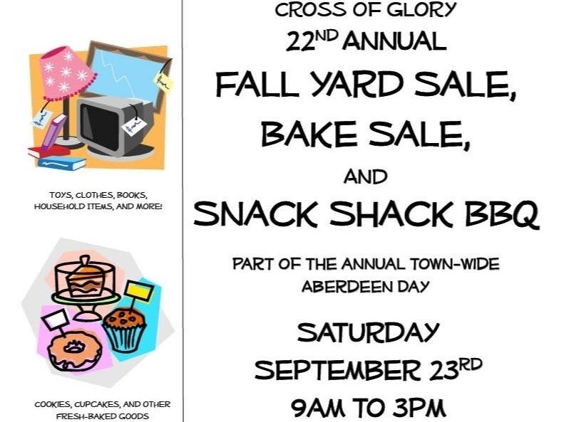 Cross of Glory Lutheran Church invites you to come check out the bargains, the baked goodies and burgers n dogs at our 22nd Annual Fall Yard Sale, Bake Sale & Snack Shack BBQ on Saturday, September 23, 2023 from 9:00 AM to 3:00 PM in the Church Parking Lot as part of the Town Wide Aberdeen Day Celebration. You'll find us at 95 Cambridge Drive in Aberdeen. It's a fall classic you won't want to miss. And if you want to donate goods to the Yard Sale, please drop them off at Cross of Glory on Friday, September 22nd between 6:00 and 8:00 PM. It's a great chance to clean out your garage and donate to a good cause. Thank you and we hope to see you there!
