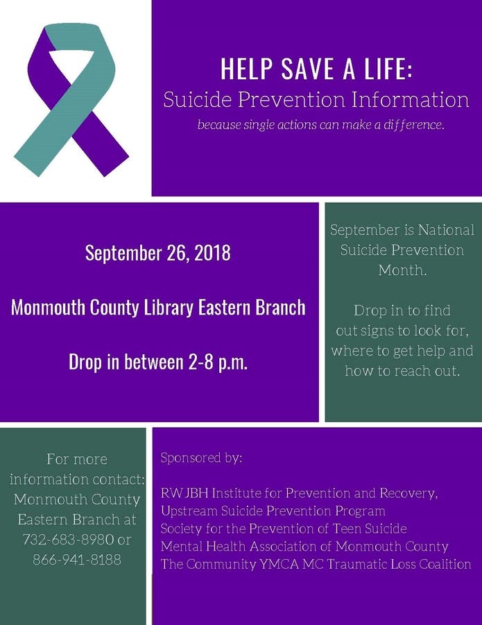 As part of National Suicide Prevention Month, The Community YMCA and several Monmouth County organizations are joining forces to host a public information and education forum entitled “Help Save a Life” on Wednesday, Sept. 26, from 2 to 8 p.m. at the Monmouth County Library Eastern Branch, 1001 Route 35, Shrewsbury.