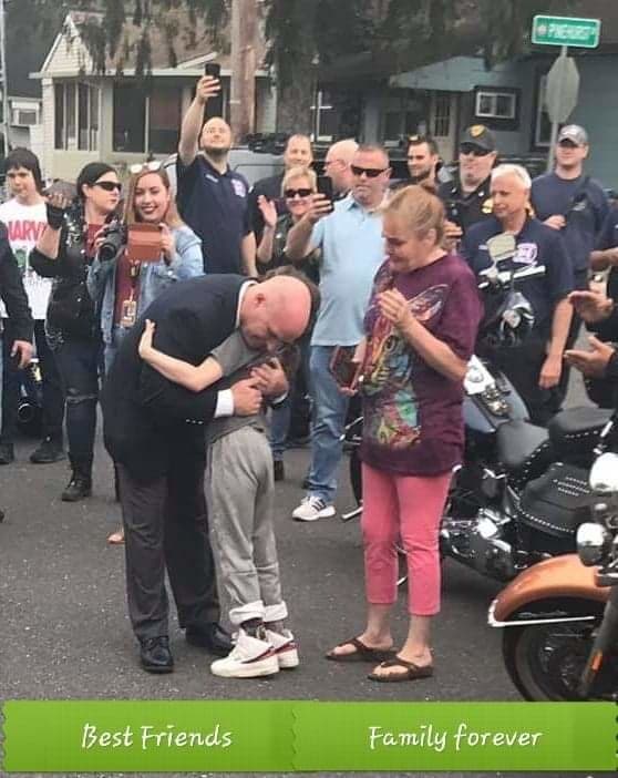 This is a photo of Jacob hugging Stephen Szczepaniak, the vice president of Matawan-Keyport Elks.