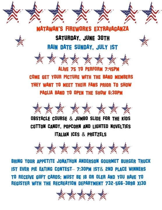Saturday, June 30 is Matawan's Fireworks Extravaganza at Lake Lefferts. The band Alive '75 will perform, and there's a pie-eating contest.